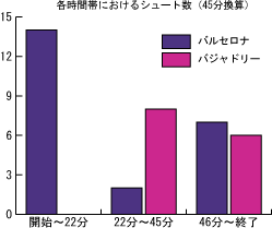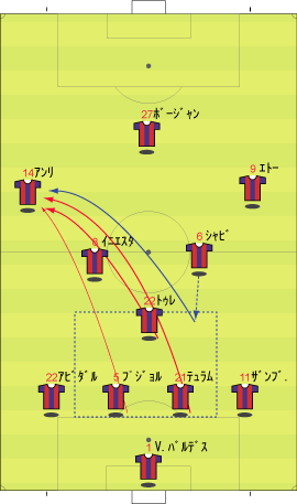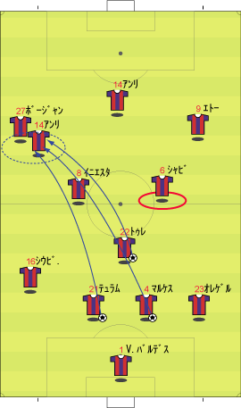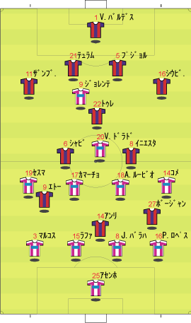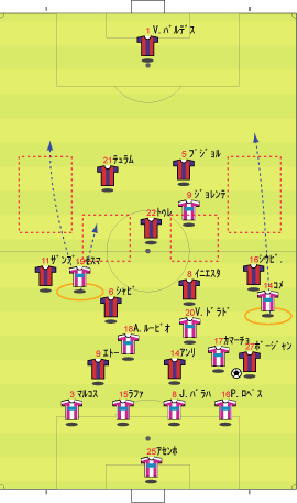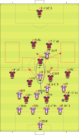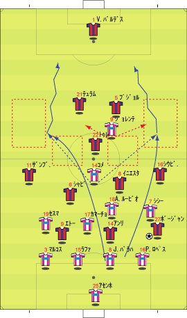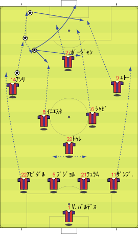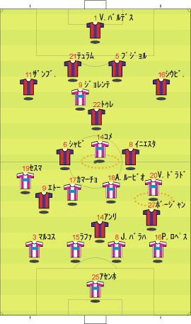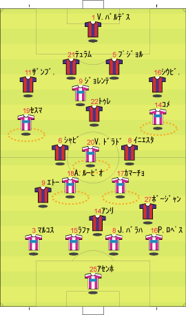 「バジャドリーは負けてしまった」 「大敗といえば大敗やな」 「スコアだけ見れば、強いバルセロナが弱いバジャドリーを難なく破ったように見える」 「ところがそうではない」 「というところを見ていきたいわけやな」 「よかろう」 「この試合のバジャドリーは、戦術的に特筆すべき事柄があった」 「先発は以下の通りやな」 「バルサの先発に不満があるなしは置いておいて、バジャドリーはトップ下にあたる位置に、ビバル・ドラドが来ているのが非常に意味深い」 「新聞の予想もそうやったな」 「バルセロナと対戦することを考えると、ここに彼を置くか、シシーやコネを置くかでずいぶんと話が違う」 「下の意味やな」 「最近のバルサは、ビジャレアル戦で見られるようにサイドバックをやたらと上げたがる」 「最近というか、昨シーズンからの癖が復活したというか」 「そうなると、上図の点線のゾーンがあく。押し込まれた状態からそこを突くには、トップ下にスピードに優れ突破力があり、サイドに流れて仕事のできる選手を置きたい」 「それをやるなら、右にシシー、トップ下にコメといった布陣が考えられる」 「ところが現実にはこう」 「トップ下はビバル・ドラドで、右にコメ」 「ビバル・ドラドの一番の弱点は、まったくスピードがないことなわけや」 「そうすると上の攻めは難しいな」 「まず、スペースで受けるためにトゥレを振り切る時点で難しいし、受けたとしても追いつかれて体で潰される」 「当たりにも強くないしな」 「そうなると、このように組んだバジャドリーの狙いは攻撃ではない、ということになる」 「まず守備が狙いやな」 「そりゃ攻撃じゃなきゃ守備やろ」 「攻守の切り換えが狙いかもしれんやんか」 「そんなわけあるかいな」 「ビバル・ドラドの任務は、トゥレのマークが主やな」 「バルサが組み立てている段階ではマンツー気味にトゥレをマークして、エリア近くに運ばれたら、ディエゴ・カマーチョとアルバロ・ルービオのヘルプに行くというのが任務やな」 「それにしても、見事なガード戦法ではないかね」 「いわゆる亀になるという感じやな」 「トップのジョレンテは、中央でロングボールを受ける選手で左右に流れてどうこうできるわけではないので、このような形に組むとまったく攻め手がなくなる」 「ちょっとびっくりするな」 「バジャドリーというチームは、サンチアゴ・ベルナベウでのレアル・マドリー戦で非常に勇敢に攻めて、7-0で返り討ちをくらった戦歴の持ち主やしな」 「監督のメンディリバルは、最近リーガで少なくなった攻撃精神をふんだんに持ち合わせた人やしな」 「それがこれだけ守るとは、さすがに7-0での敗戦がこたえたのかと思いきや」 「途中からえらいことになる」 「まずは、22分で、その1分前にエトーのゴールでリードを奪われる」 「そうすると、突然下の配置になる」 「コメがトップ下に来て、ビバル・ドラドは右に移る」 「これは、要するに、上で検討したバルサを攻めるための配置に近い」 「右にビバル・ドラドはどうなん、という気がせんでもないけどな」 「彼がボランチに近くなることで、左のセスマを押し上げることができるから、それはそれでええやろ」 「そうなんかね」 「コネはビバル・ドラドのようにマメにマンマークなどできないから、トゥレが空く、その代償として、スピードをいかしてスペースを縦に進むことができる」 「ガードを解いたわけやな」 「これは面白いな」 「試合の前から、リードを奪われたら配置を変えろと指示されていたわけか」 「この素早い変更はそうとしか考えられない」 「バジャドリーの変化にバルサは対応できず、押されはじめる」 「結局、テュラムがPKを取られて、前半は1-1で終わる」 「前半1-0でしのいで、後半勝負、という考えも成り立つ中、試合前から殴られたら殴り返せと指示を出していたメンディリバルはさすがの攻撃精神の持ち主やな」 「その心は、後半さらなる形で発揮される」 「46分にボージャンに決められた後やな」 「1-4-3-3に見える」 「見えるというかそのまんまやな」 「その意味は下の図で、攻めるなら攻めて下さい。そのかわり、こっちもそちらの残したスペースをいただきますよ、ということになる」 「バルサ相手にほとんどノーガード戦法か」 「普通これはできない」 「ボールを持たせたら天下一品のバルサと叩き合ったら、普通潰れるしな」 「まあ、結果的には、この後2点を追加されて、見事に潰れるんやけどな」 「得点的にはそうやけど、バルサも相当危なかったで」 「バジャドリーのシュートが2回枠を叩いたしな」 「あれはほんの少しのズレでゴールやで」 「まあな」 「それに、2点を取ったバルサばかりが攻めていたわけではない、という一つの証が下のグラフや」 「なんや、これは」 「バジャドリーが守備に徹していた開始から22分まで、ガードを解いた22分から前半終了まで、そして、後半に入ってからの