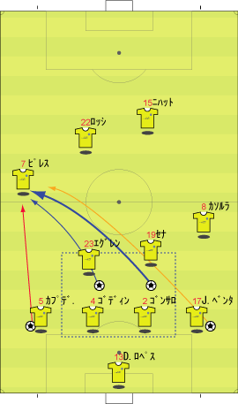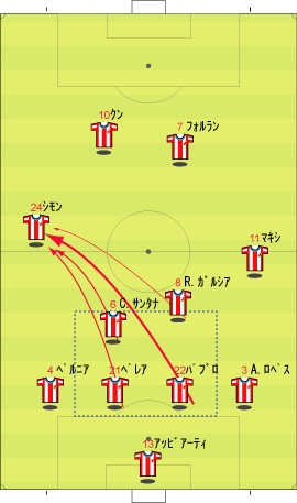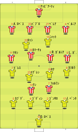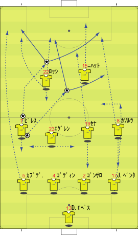 「ビジャレアル対アトレチコ・マドリー」 「注目の一戦はビジャレアルの完勝に終わった」 「内容も結果もというやつやな」 「ビジャレアルはいまやリーガの良心と呼ばれつつある」 「レアル・マドリーもバルサもアトレチコも今ひとつの世の中で、チームとしてきちんと設計されたチームではあるな」 「今回は、その設計の一部を見ていこう、とまあそのようなわけや」 「よかろう」 「先発は以下のようになっていた」 「アトレチコの左がシモンでないことを除けば、いつものみんなという感じやな」 「この試合で、誰がすごかったかというとピレスがすごかった」 「抜群の働きやったな」 「ビジャレアルの1点目と2点目は、まさに彼が起点になっていて、最初は左からドリブルで中央に持ち込んだボールを左に流れるロッシにパスしたところから始まった」 「2点目も崩す流れとしては、同じ形やった」 「ビジャレアルの動きを見ると、明らかに左のピレスが中心で、模式的にあらわすと下のようになる」 「ピレスが中に入ってロッシが外に逃げる、カプデビラが外側からフォロー中にセナが入って、ニハットとカソルラがゴール前、右のベンタはあまり深いところまで上がらず、組み立てに重点を置くと」 「そのような感じやな」 「ここで最近よく思うことがあるのだがな」 「なんや」 「リーガの上位というのは、左利きのチームばかりではないかね」 「左利きか」 「左サイドを中心に崩していくチームを左利きとすると、このビジャレアルは正に左利きやろ」 「まあそうやな」 「普段のアトレチコ、つまり、左にシマオがいる時は、これまた左利きやろ」 「シモンな」 「図でいうと下の感じや」 「シモンがサイドでボールを受けて、ざっと縦に押し込んで、そこから縦か中の二択か」 「シモンはドリブルのスピードでピレスに勝る代わりに、パスでは劣るのであまり複雑な攻めはできない」 「キャラクターの違いというやつやな」 「アトレチコがいい形で攻める時はこれが多く、いうたら左利きや」 「そうかね」 「そんで、バルサも左利きやろ」 「アンリやな」 「左にボージャンでもいいけど、相手をより崩せるのはアンリの方や」 「とーんとーんとすこし跳ねるようにドリブルをして、ぎゅっと縦に抜けるか、そのフェイクから中にいくかが得意技やな」 「縦にいったらクロス、中に入って逆サイドへのシュートか上がってくるイニエスタ、シャビにパス」 「アンリ・パターンというやつやな」 「右から有効に崩す場面というのはほとんどない」 「エトーは中に入るし、ザンブロッタが上がってもさして効果的ではないしな」 「つまり、バルサも左利きや」 「さよか」 「2年前、ロナウジーニョがいたころはさらに極端な左利きやったしな」 「過去形にしたらあかんで」 「そして、去年の12月頃、勝っていたころのマドリーも左利きやったやろ」 「ロビーニョか」 「ロビーニョやな」 「シモンと似たような特徴やけど、中に入っての細かいパスがよりうまい」 「相手を引き付けてからのプレーもうまいな」 「つまりは、以上のみなさんすべて左利きなわけや」 「ほほう」 「システムこそ違え、左の前にサイドからゲームを動かす選手を置く、というのは一つの形やと思うんやな」 「その形の強いチームは多いな」 「デコのいたポルトとかやな」 「セードルフのミランもその変形やな」 「昔はロベルト・バッジョのいたインテルも同じような手段を使っていた」 「リーガに関係の深いところでは、リケルメのいたビジャレアル、ジダンとチャンピオンズリーグを取ったレアル・マドリーなんかがそうやな」 「まあ、強いチームを作る一つのパターンであることは確かやろ」 「今のマドリーとバルサはお世辞にも強いとはいえんけどな」 「それは言わないお約束や」 「なんにしても、このタイプの設計では、その鍵になる左前の選手をいかすために、色々な条件が必要になる」 「そうやな」 「ここでは、その中でも特に重要な一点だけに絞ってチームを見てみようと思うんや」 「もったいぶらんでもええがな」 「話は単純で、下の図やねんけどな」 「なんやこれは」 「要するに、後方からどの形でボールを入れるのが一番いいか、という話や」 「ほうほう」 「まず、右から見ていくと、右サイドバックから、左の中盤に出るパス、これが一番いい」 「いいというか、効果的ということやな」 「これが決まれば、ほぼ間違いなく左前の選手はフリーでボールを持つことができる」 「ディフェンスの移動が間に合わへんからな」 「ディフェンスはボールがあるサイドによる習性があるからな」 「ただ、これは難しいな」 「それはある」 「まず、この距離を正確に蹴れる選手が少ないし、ボールスピードが足りなければ前に出るサイドバックにカットされてカウンターを喰らってしまう」 「悩み深いところや」 「ベッカムやゼ・マリアとかなら可能かもしれんが、まず人材が見つからない」 「