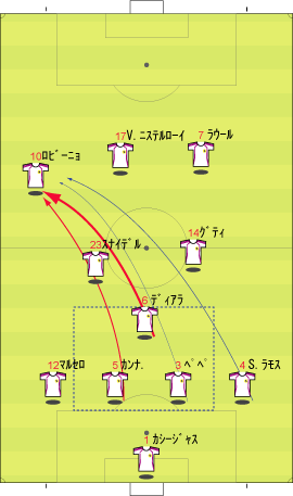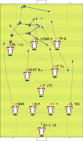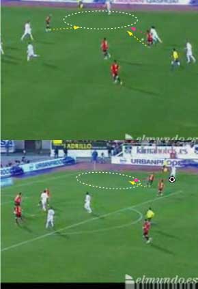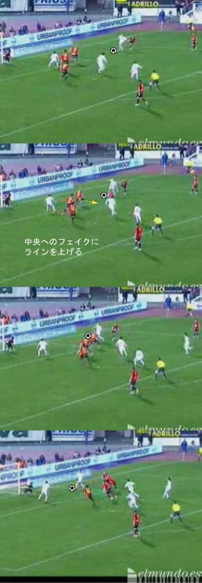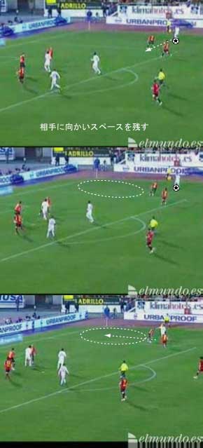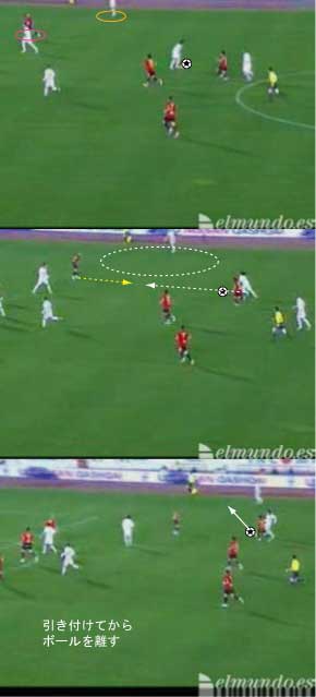 「1-1やったな」 「2位のビジャレアル、3位のバルセロナは差を詰めるチャンスだったわけだが」 「両チームともこけて、7ポイント差は変わらず」 「なかなか縮まらないもんやな」 「マドリーこけたらみなこけるというのが流行やしな」 「けったいな流行やな」 「とりあえず、先発はこうやな」 「両チーム普通といえば普通かね」 「マジョルカはイバガサを中央に置いて、そこからの組み立てを重視したタイプやな」 「イバガサは、トップ下や左で使われることもある」 「マドリーはディアラとバチスタを外して、中盤から前に上手い選手をそろえたタイプの布陣を採用している」 「まあそうやな」 「そんでや」 「なんや」 「一口に上手いと言っても、色々と種類がある」 「まあそうやな」 「この試合では、マドリーのゴールシーンで、一つ典型的な上手さをあらわすシーンがあったので、それを見てみようと思う」 「ええで」 「まず、一つ目は下の写真や」 「中盤でガゴがボールを受けた場面か」 「一番上の写真で、ガゴがボールを受けて、サイドに一人選手が余っている」 「ロッベンやな」 「そこを有効に使おうと思えば、赤い円で囲まれたディフェンスを消してしまえばいい」 「その選手が一番サイドに近いからな」 「それをどうやって達成するかといえば、2番目の写真のように、ボールを持った選手が真っ直ぐそのディフェンスに向かっていけばいい」 「いわゆるピンという奴やな」 「ディフェンスというのは、向かってこられると進路を空けるわけにはいかないから、その方向にピン止めされた状態になる」 「それによって、点線のゾーンが空くわけやな」 「そして、十分に敵を引き付けてからボールを離せば、めでたくサイドにフリーの選手ができる」 「定石といえば定石やな」 「まったく同じ状況が下でも見られる」 「これは、上でサイドに出たパスを、前に出たロッベンが受けた場面やな」 「サイドでボールを止めたロッベンは、中央を向くと、最も近いディフェンダーに向かってドリブルをはじめる」 「その狙いは、要するに、2枚目の写真にあるゾーンを空けることやな」 「さっきと一緒で、進行方向に敵をピン止めして、その横にスペースを残す」 「そこから一気にドリブルで縦に抜けるわけやな」 「最後のプレーがパスかドリブルかの違いこそあれ、使われている手筋はまったく同じなわけや」 「そうやな」 「以上のプレーは当たり前といえば当たり前なわけだが、下手な選手がやれば下のようになる」 「ふむ」 「要するに、敵に向かわずに最初からスペースに向かい、結局ディフェンスをそちらに寄せてしまって、肝心な場所を埋めてしまう」 「下手というか、何も考えずにプレーすると、選手は大体赤い矢印のように動くな」 「それは結局、下手ということなんや」 「そうなんかね」 「サッカーにおける上手、下手の最初の分かれ目は、ボールを持った後、どれだけ目の前の敵に正対できるかで、それができない選手はいつまでたっても二流なんや」 「ほほう」 「それで、ドイツワールドカップの日本代表で、最もできなかった部分がそこなんやな」 「まあ、あれはチームが上手くいってなかったしな」 「チーム云々の前に、あれだけ相手に向かうことができないのは個人としての能力の問題やで」 「しかし、なんで今さらそんなことを持ち出すんや」 「この前、フェネルバッチェとチェルシーが試合をしたやろ」 「したな」 「フェネルバッチェの監督はジーコやろ」 「ジーコやな」 「今のジーコのサッカーには、日本代表監督をしたことで学んだことがいかされていると思うんや」 「それはそうやろな」 「その一方で、日本はジーコから学んだことをどのくらいいかしているのだろう、と考えると、どうにも心もとない」 「まあ、失われた四年らしいからな」 「失われたと断言する以上、そこから得たものがないというこやろ」 「そうなんかね」 「ジーコが学んだことをいかして、日本がジーコと過ごした時からなにも学ばず、学ぼうとする意思も薄弱であるとしたら、それはどういうことなんだろうかと思ったわけや」 「ジーコは自分が失敗したから、そこから学んで当然で、その失敗の犠牲者である側は学ぶことなどない、ということちゃうかね」 「はたして、それで正しいんやろか、そんなことでは本当に失われた四年になりはせんのだろうか、などということを、つらつらと考える今日この頃であるわけや」 「さよか」 「チェルシー対フェネルバッチェ戦では、そのようなことを頭の片隅に置いて見られるのもいいのではないかというところで」 「また次回」 「ごきげんよう」 おまけ:マジョルカのラインコントロール